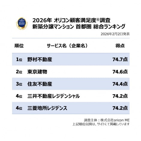【おすすめの新築分譲マンション 首都圏ランキング TOP5】オリコン顧客満足度調査(C)oricon ME inc.